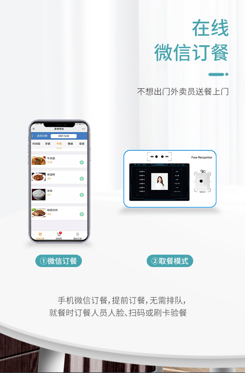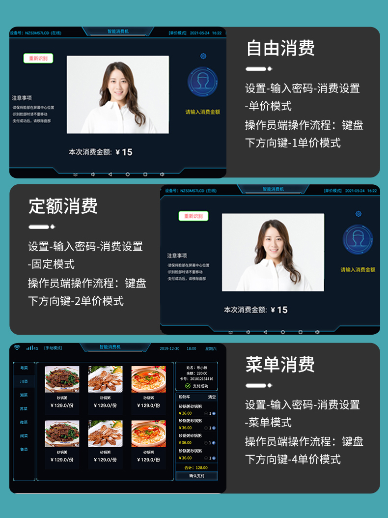 人臉識別消費管理系統:識別速度快、識別準確度高、免接觸、防盜刷、無損耗等功能,可靠的質量保證及完善的技術服務和售后服務保障企業食堂刷臉識別消費更加安全。